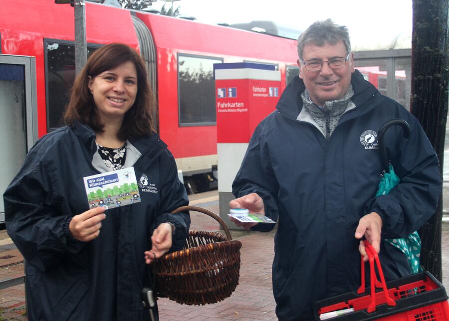 Als kleines Dankeschön verteilten Anja Schäffler, die Klimaschutzmanagerin des Kreises Ostholstein und Horst Weppler, Leiter des Fachdienstes Regionale Planung, Postkarten und Minzdrops.
