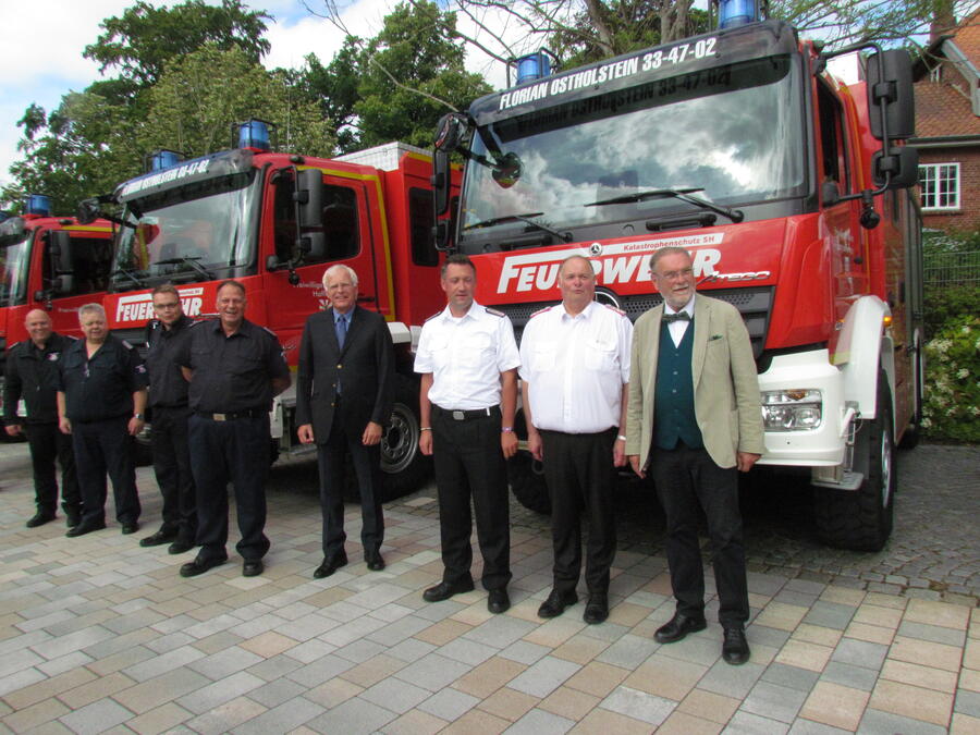 Insgesamt vier Löschfahrzeuge Katastrophenschutz wurden an die Gemeinde- und Ortswehrführungen der Freiwilligen Feuerwehren Damlos (Dirk Prüß), Burg auf Fehmarn (Dirk Westphal), Haffkrug (Sven Reimers) und Hutzfeld-Brackrade (Sven Witt) übergeben.