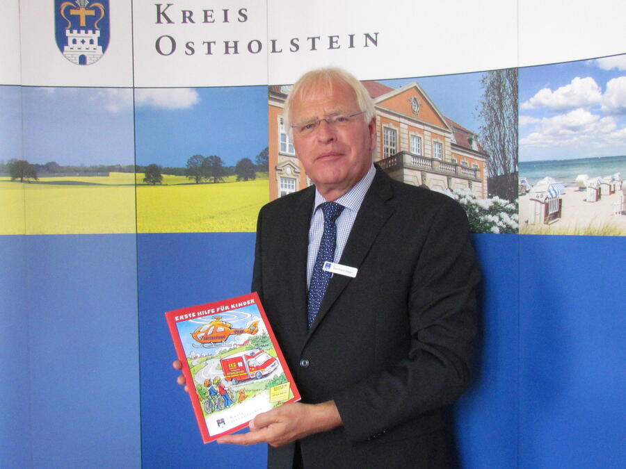 Foto: Landrat Reinhard Sager mit dem neuen Erst-Hilfe-Arbeitsbuch, Foto Kreis Ostholstein, Bildnachweis: Abb. Buch @ K&L Verlag