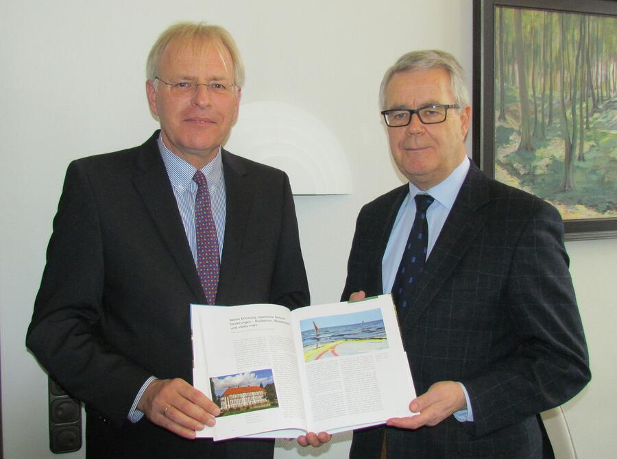 Eutin. Kreispräsident Ulrich Rüder und Landrat Reinhard Sager stellten heute (6. Februar) einen neuen Bildband über den Kreis Ostholstein vor. Entstanden ist ein umfassendes, informatives Buch in Zusammenarbeit mit dem Verlag Kommunikation und Wirtschaft aus Oldenburg (Oldenburg). In über 20 Beiträgen können sich die Leserinnen und Leser von der Vielfalt des kommunalen, kulturellen und wirtschaftlichen Lebens in Ostholstein ein Bild machen. Zahlreiche Unternehmen haben außerdem das Angebot des Verlages zur Selbstdarstellung genutzt und tragen mit ihren Portraits zur Vielfalt des Buches bei. Sager und Rüder dankten den Autoren und den Unternehmen ganz herzlich für ihre Mitwirkung.
