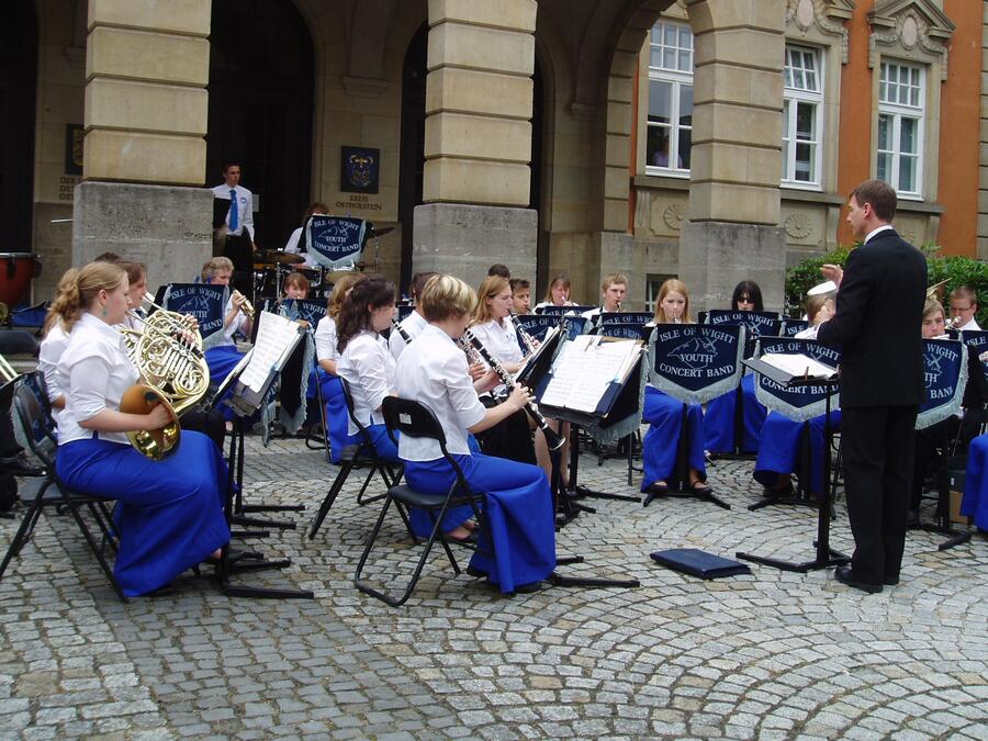 Eutin. Ein öffentliches Konzert vor dem Eutiner Kreishaus gab heute (11. August) die Youth Concert Band von der Isle of Wight. Wie auch schon in den Jahren zuvor sind die 36 jungen Musiker auf Einladung des Partnerschaftsvereins Ostholstein / Isle of Wight in der Region zu Gast. Landrat Reinhard Sager und Kreispraesident Joachim Wegener begr[-ten die Musiker vor ihrem Auftritt.