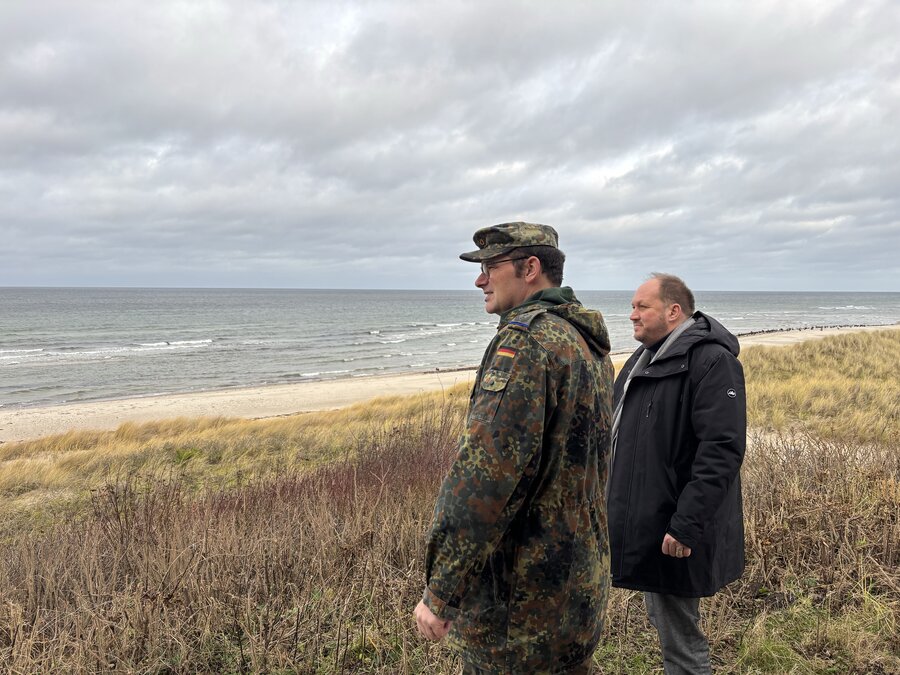 Der Landrat besucht den Truppen·übungs·platz Putlos. Der Landrat heißt: Gaarz. Auf dem Truppen·übungs·platz üben Soldaten für den Verteidungsfall. Der Landrat will mit den Soldaten reden. Und er will sehen: Wie arbeiten die Soldaten?